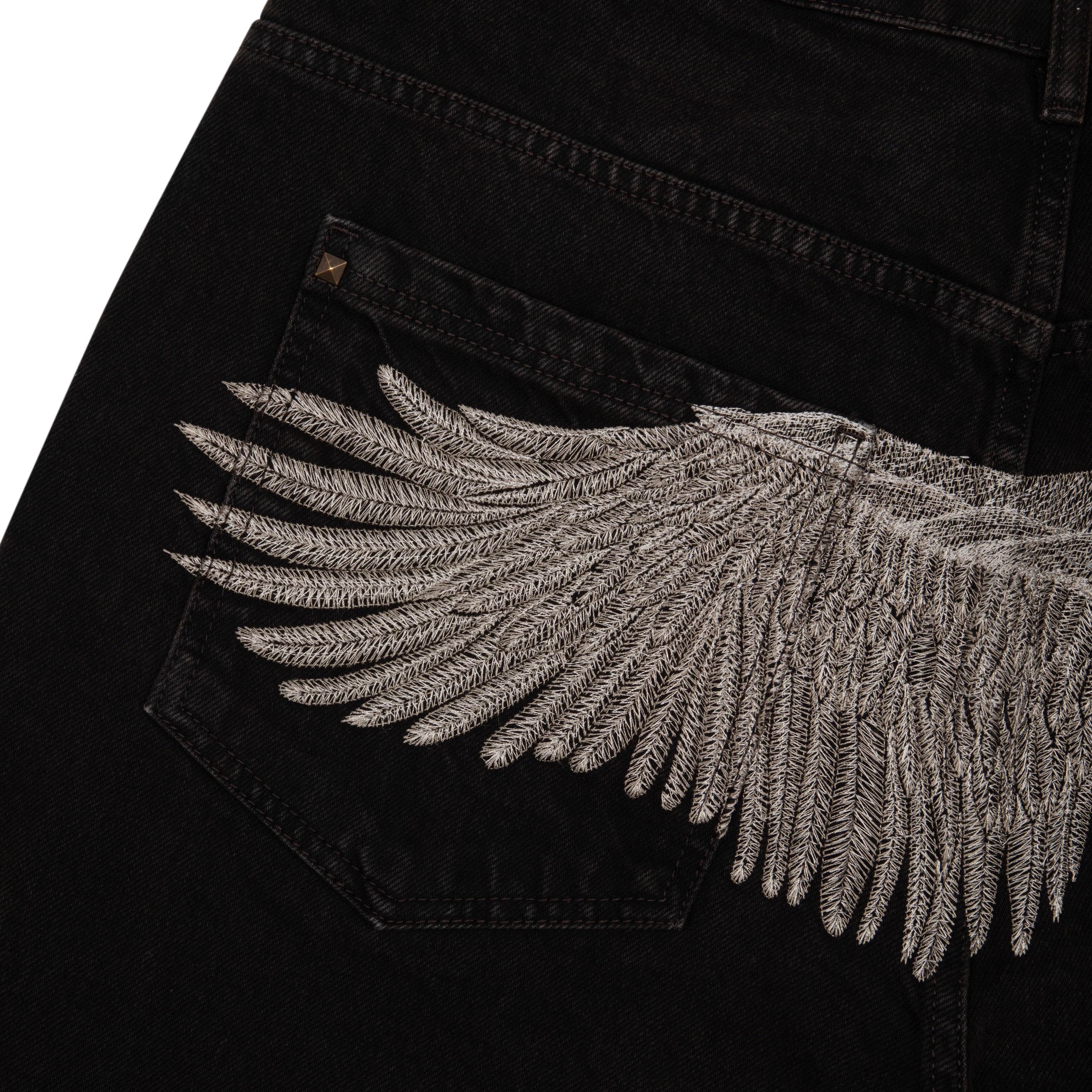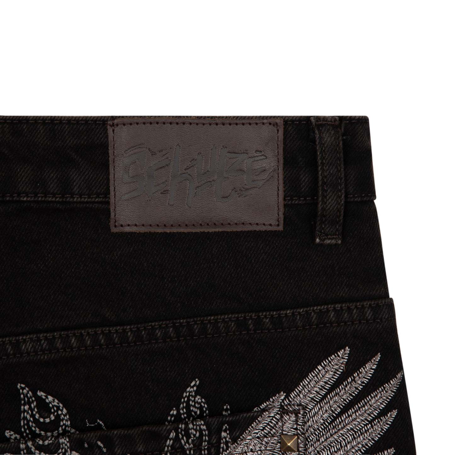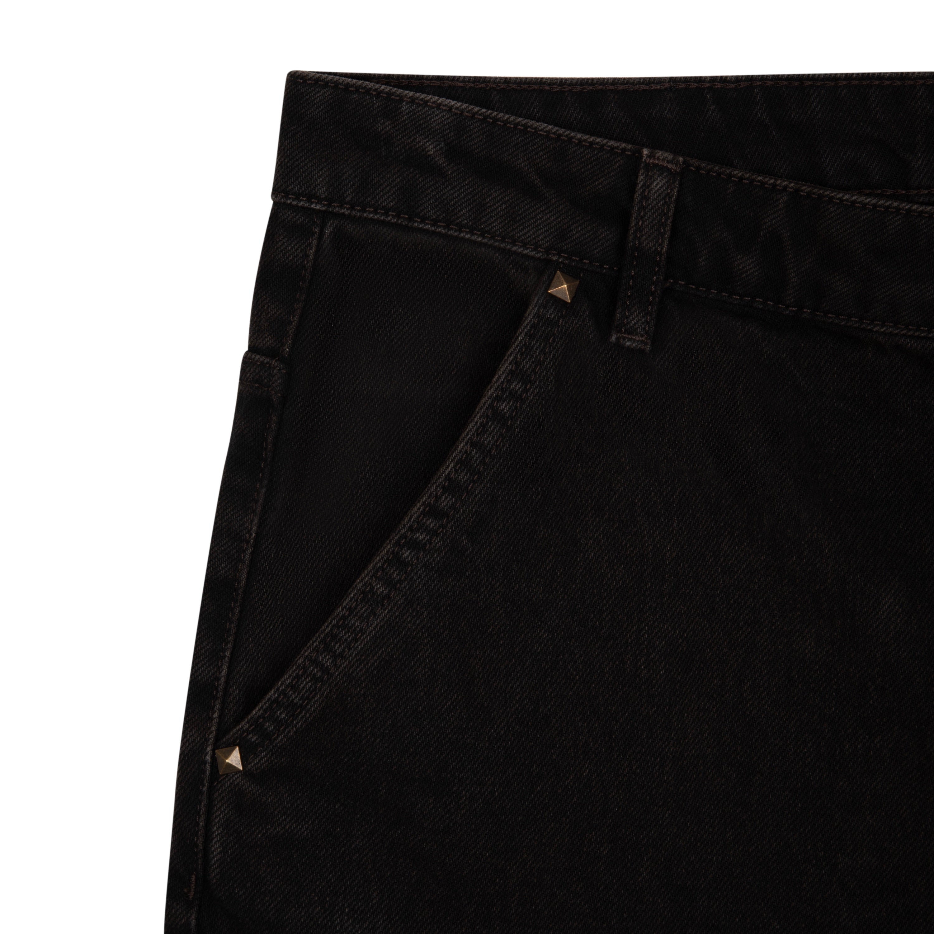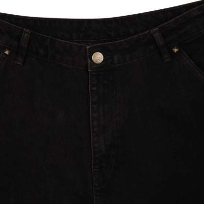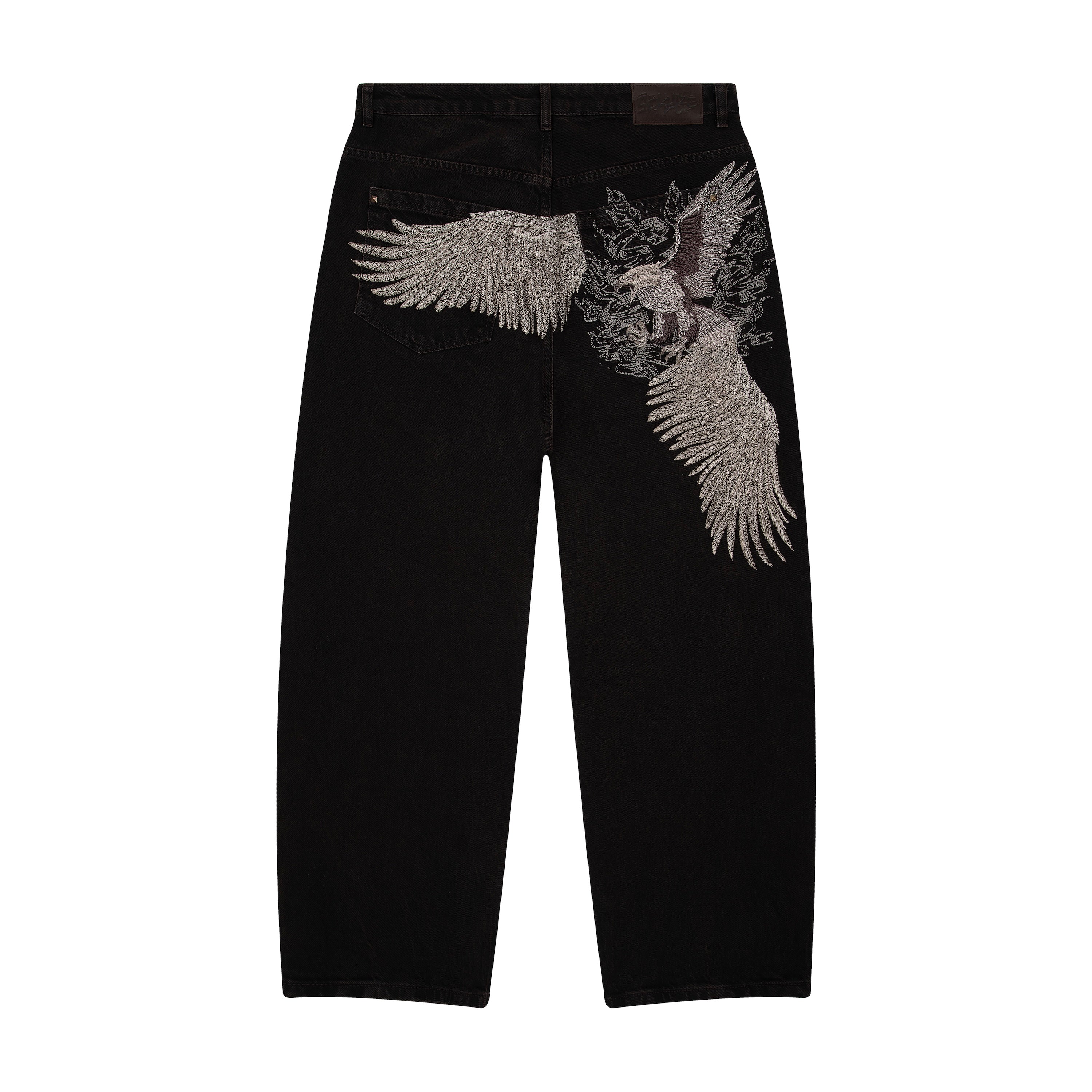 14,5oz denim / 100% cotton / embroidery on back / embossed printed leather patch /metal-studded denim pockets / wash inside out / balloon fit / fits true to size