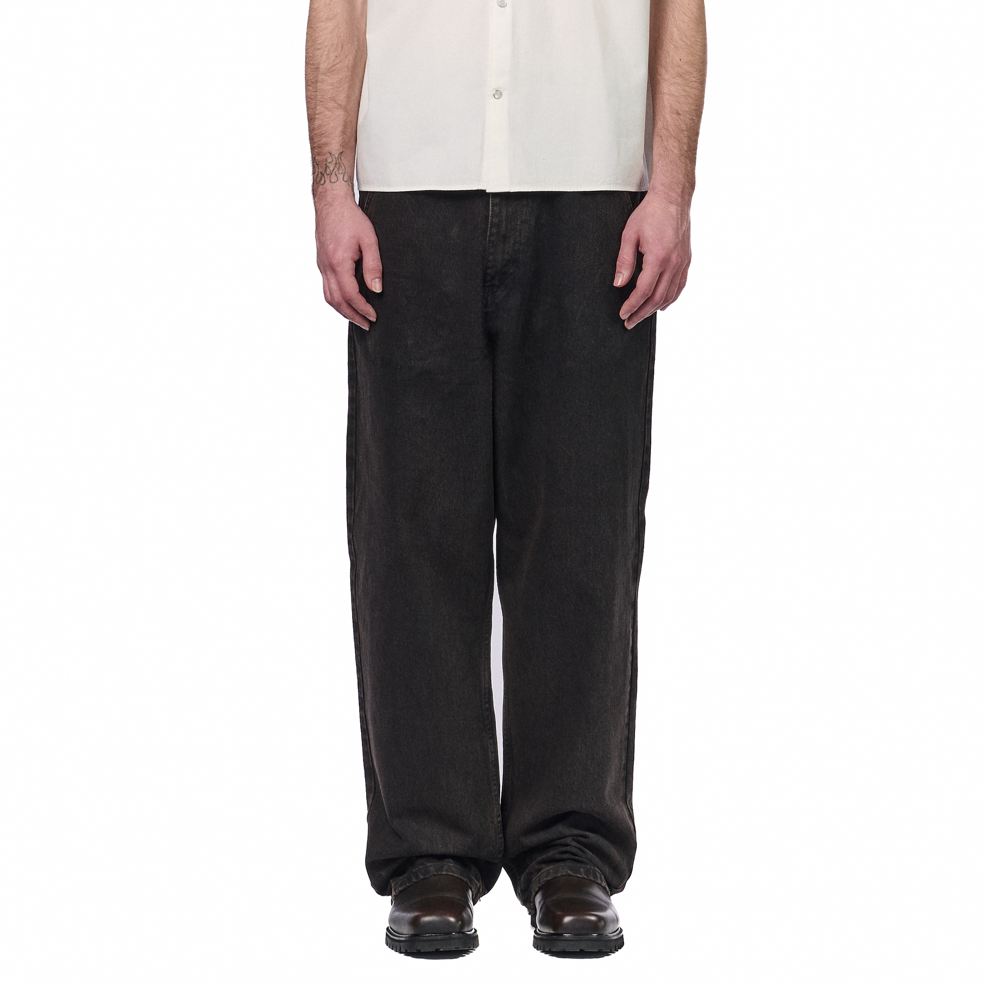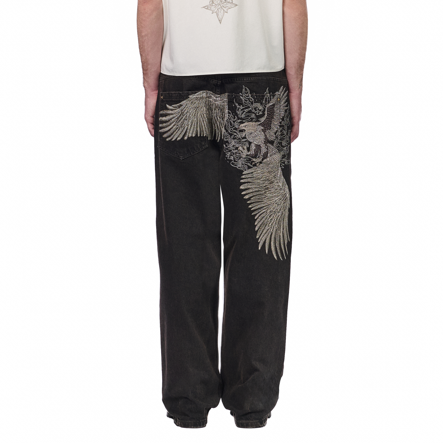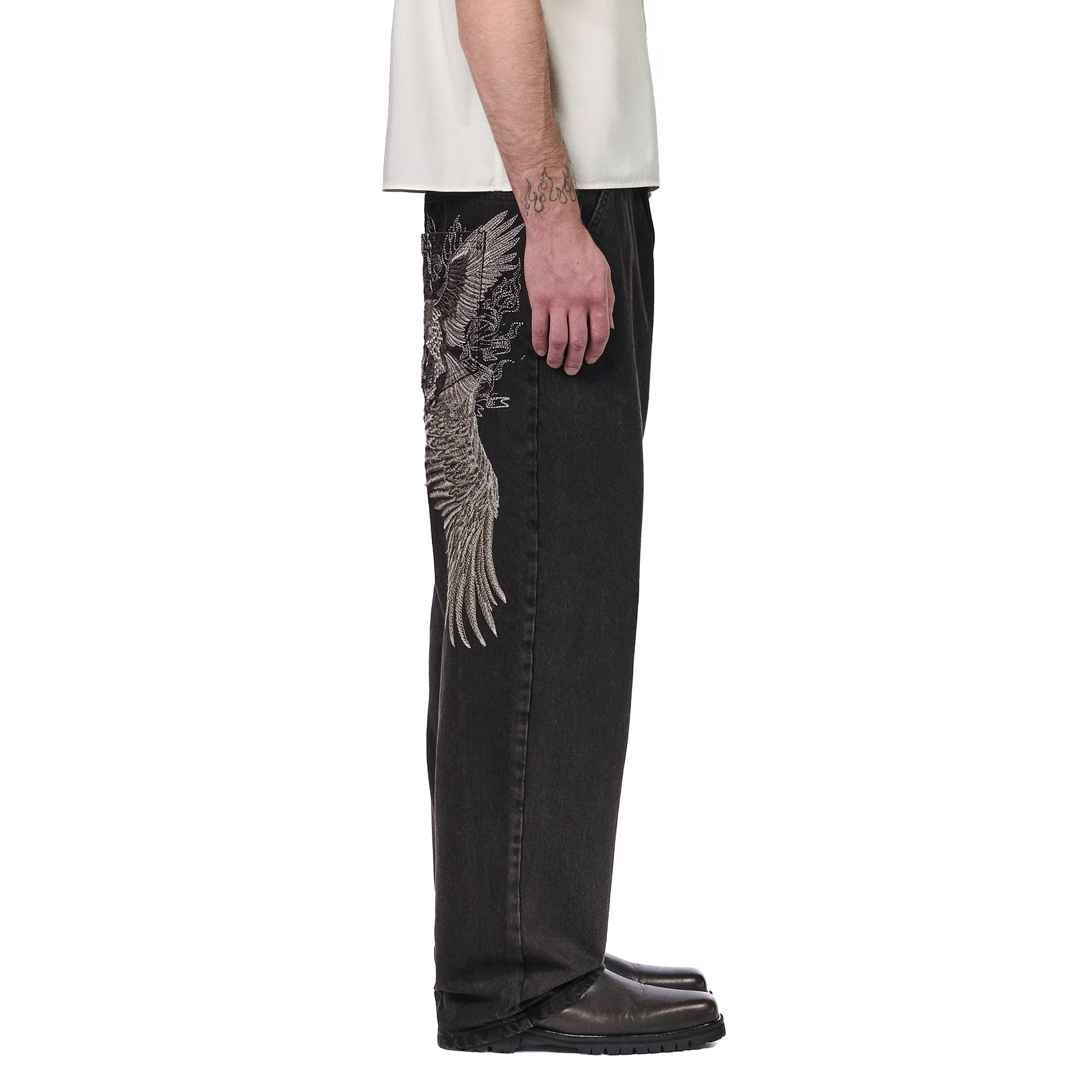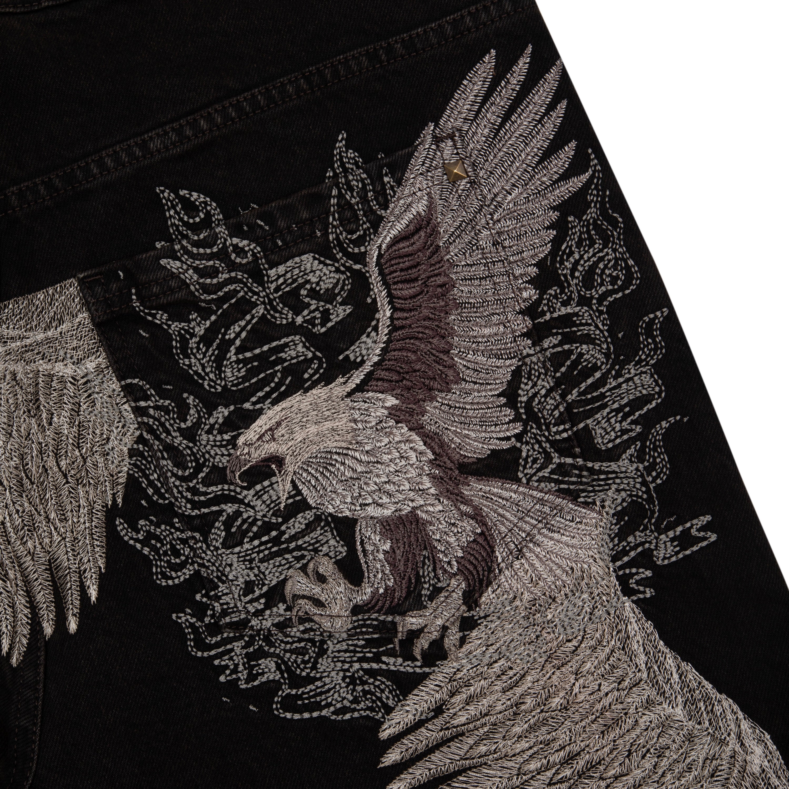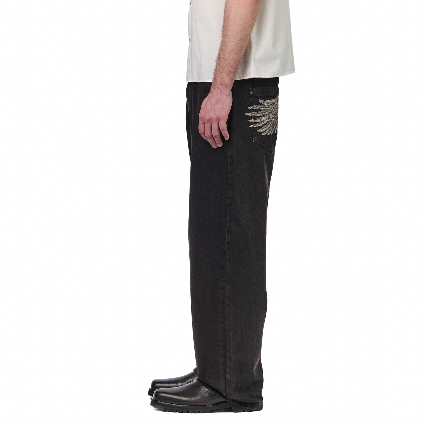 14,5oz denim / 100% cotton / embroidery on back / embossed printed leather patch /metal-studded denim pockets / wash inside out / balloon fit / fits true to size