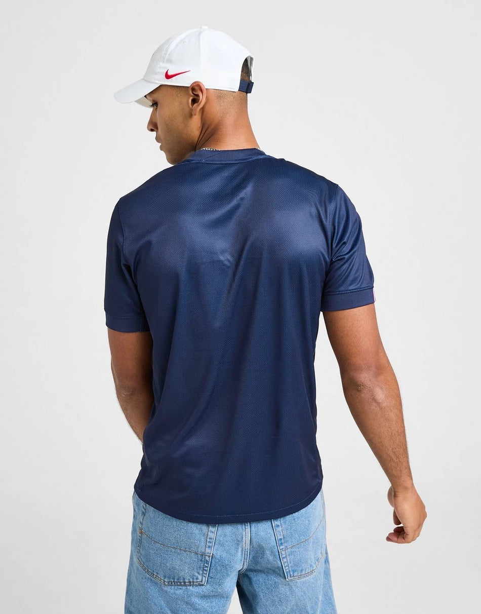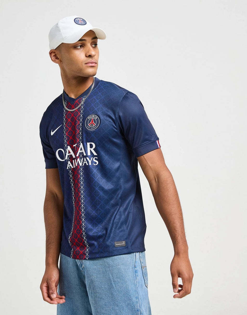 Back Les Parisiens on the big stage in this men's Paris Saint Germain 2025/26 Home Shirt from Nike. In a Midnight Navy and University Red colourway, this shirt is made with smooth, lightweight polyester for total comfort. It has a crew neckline and short sleeves for easy wear, while Dri-FIT sweat-wicking keeps you feelin dry. With an Eiffel Tower-inspired stripe, it's signed off with the Swoosh logo and a woven Paris Saint Germain crest on the chest. Machine washable.