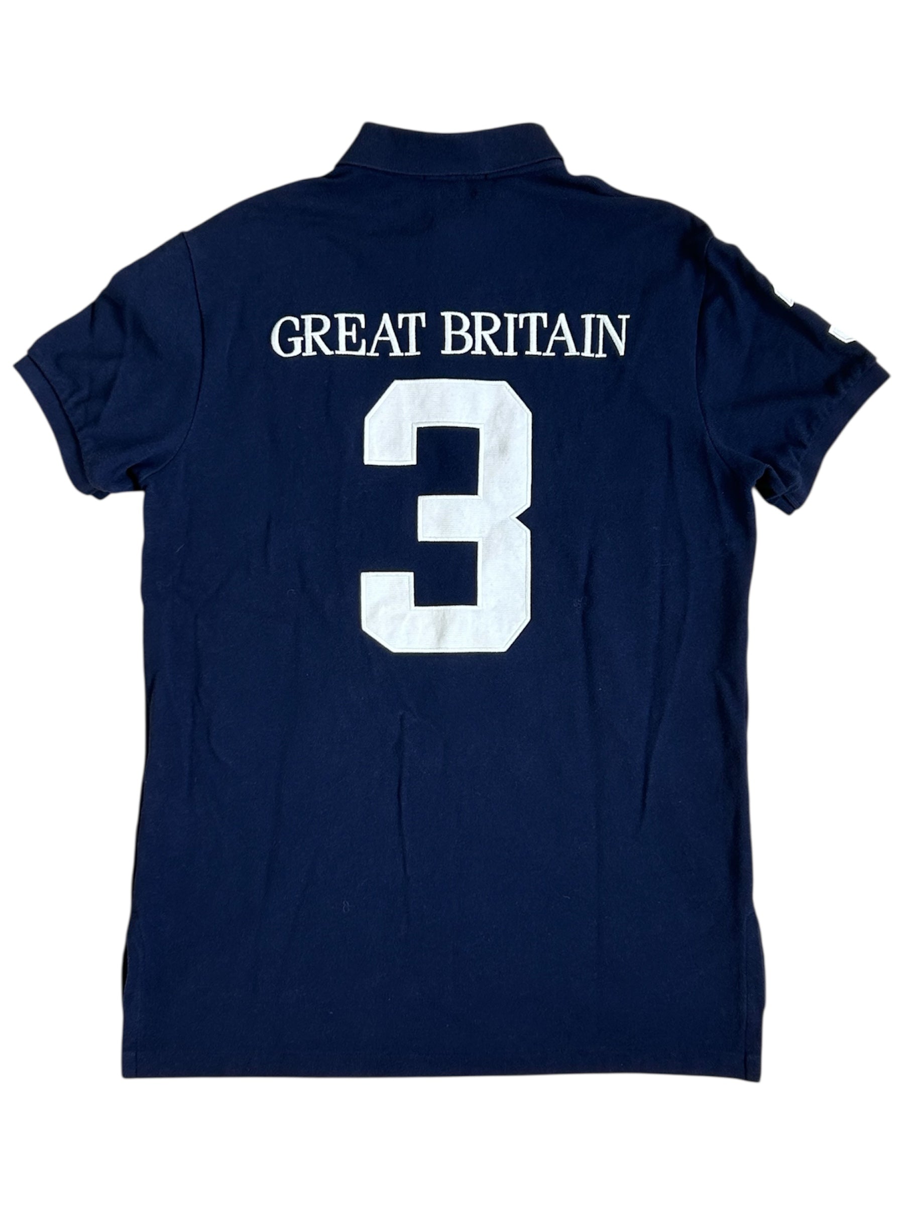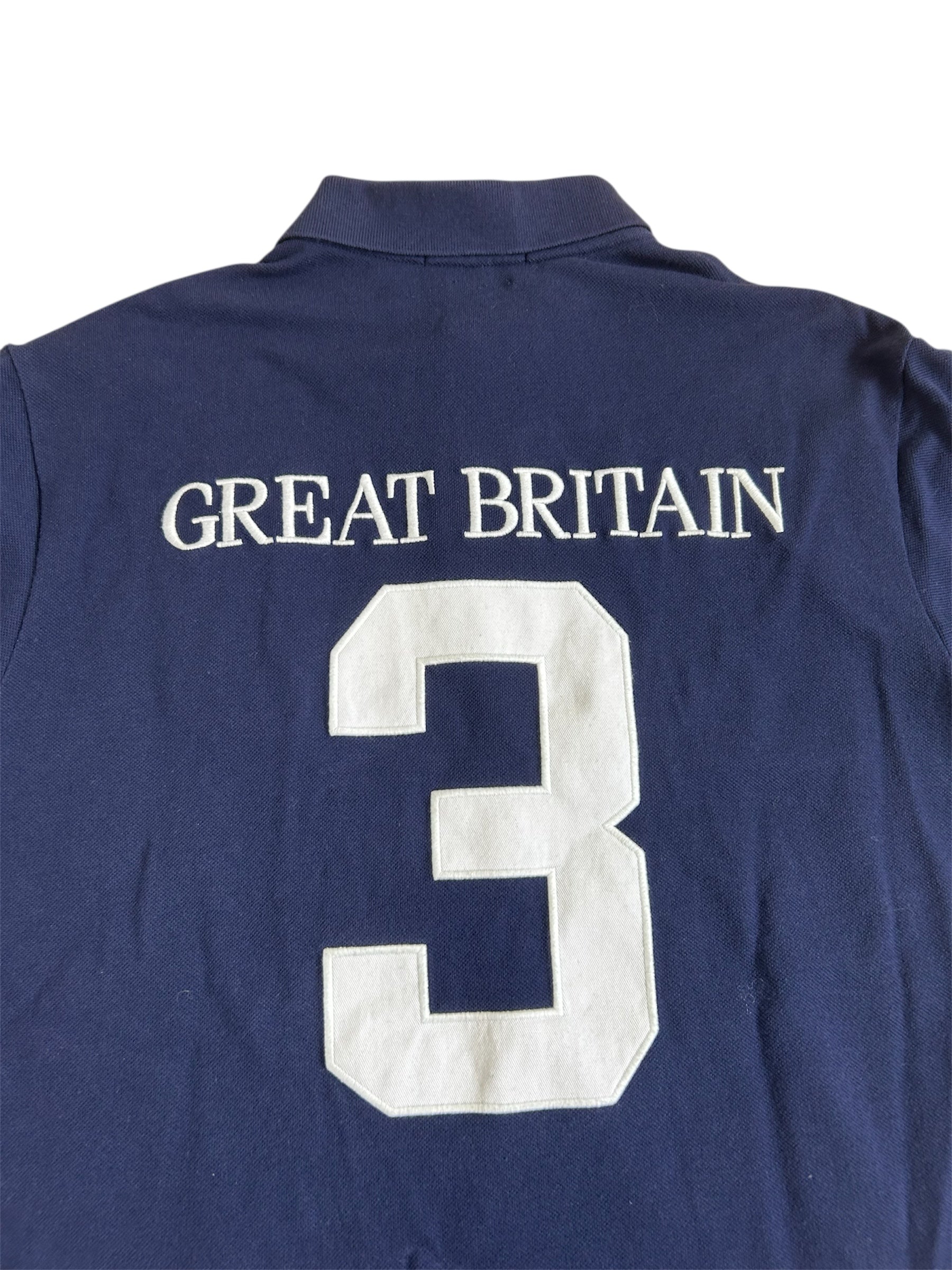Made from 100% high-quality cotton, it features the Big Pony logo, bold “GREAT BRITAIN” lettering, an embroidered Great Britain flag crest, and the number 3 on the right sleeve—a signature detail in Ralph Lauren’s polo designs. No longer in production, making it a rare and collectible item for Ralph Lauren enthusiasts.