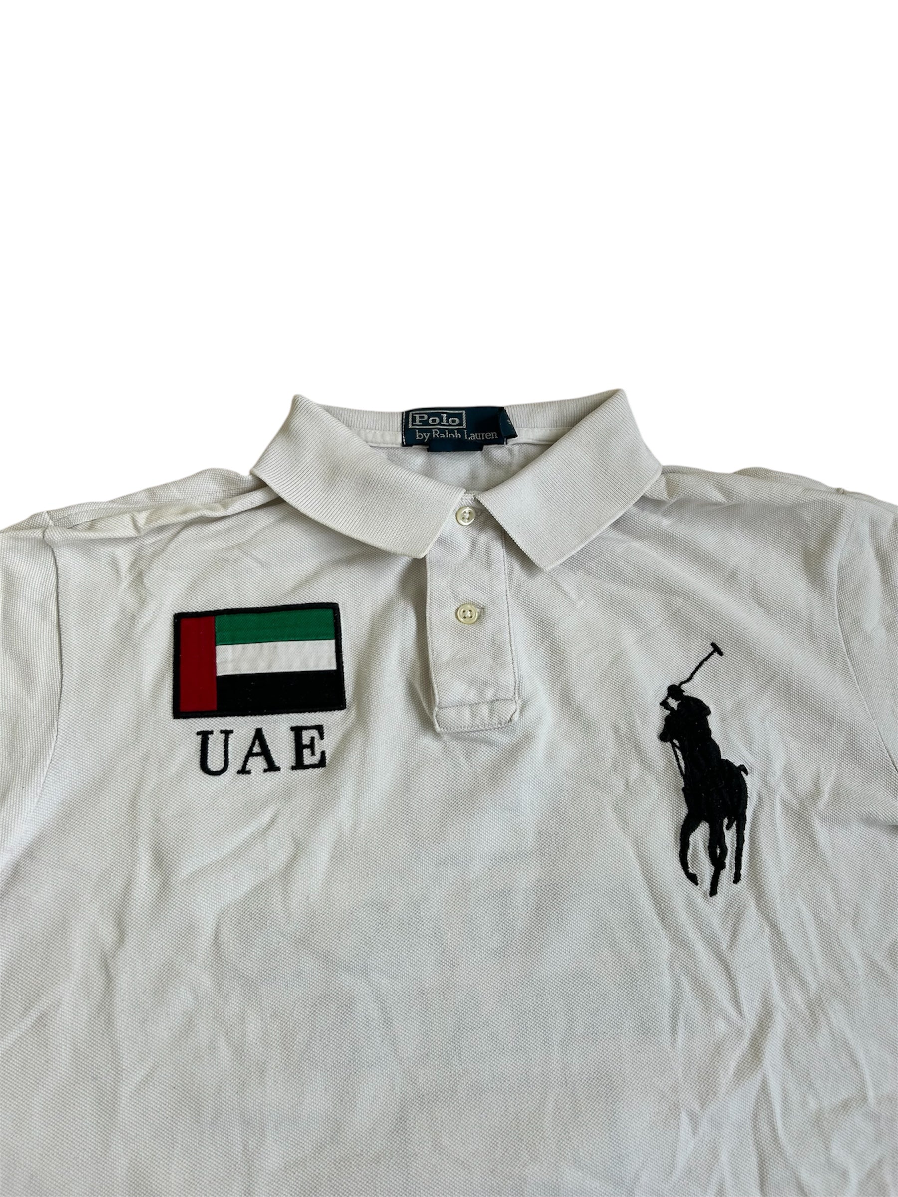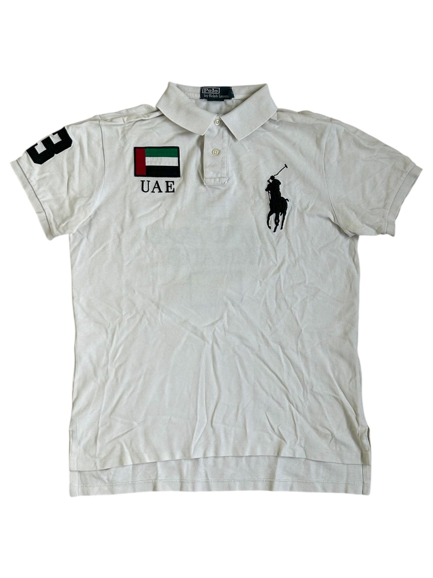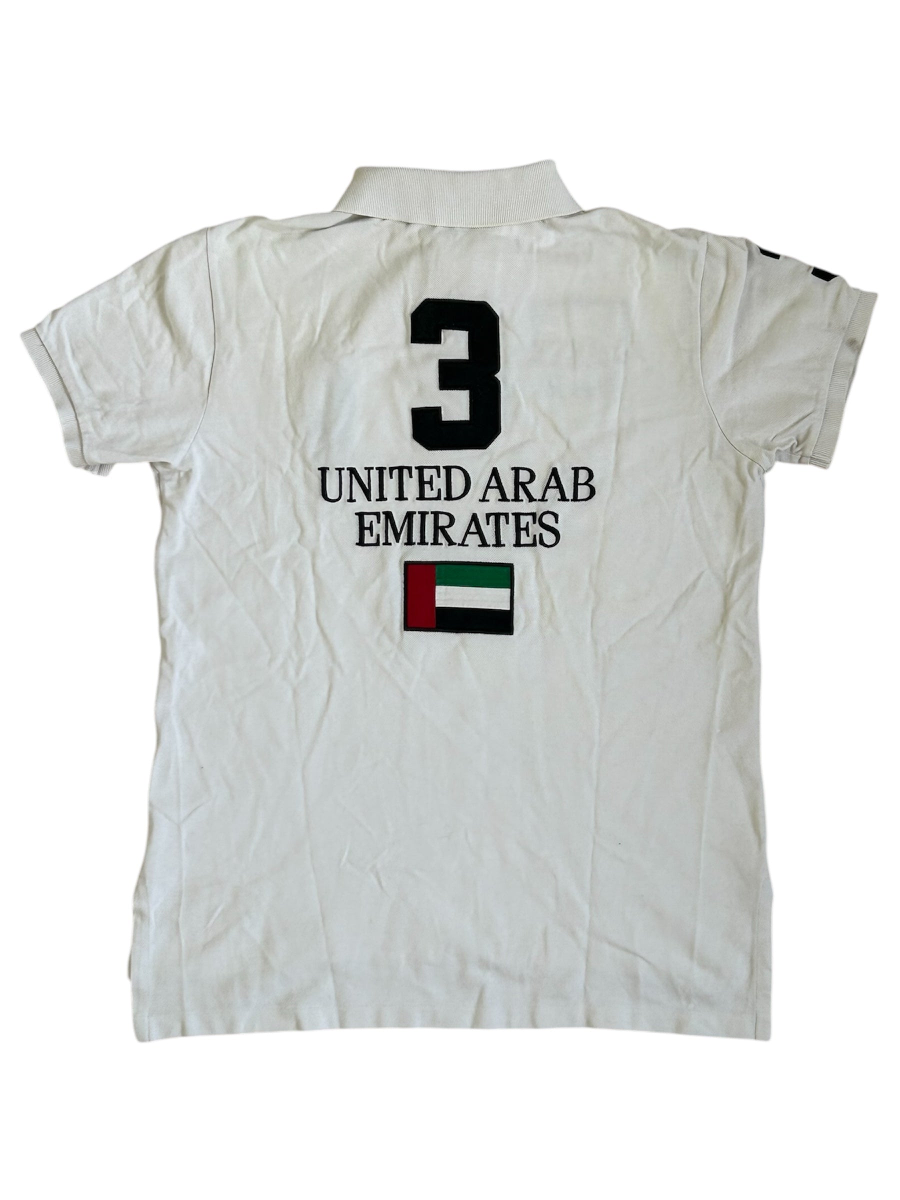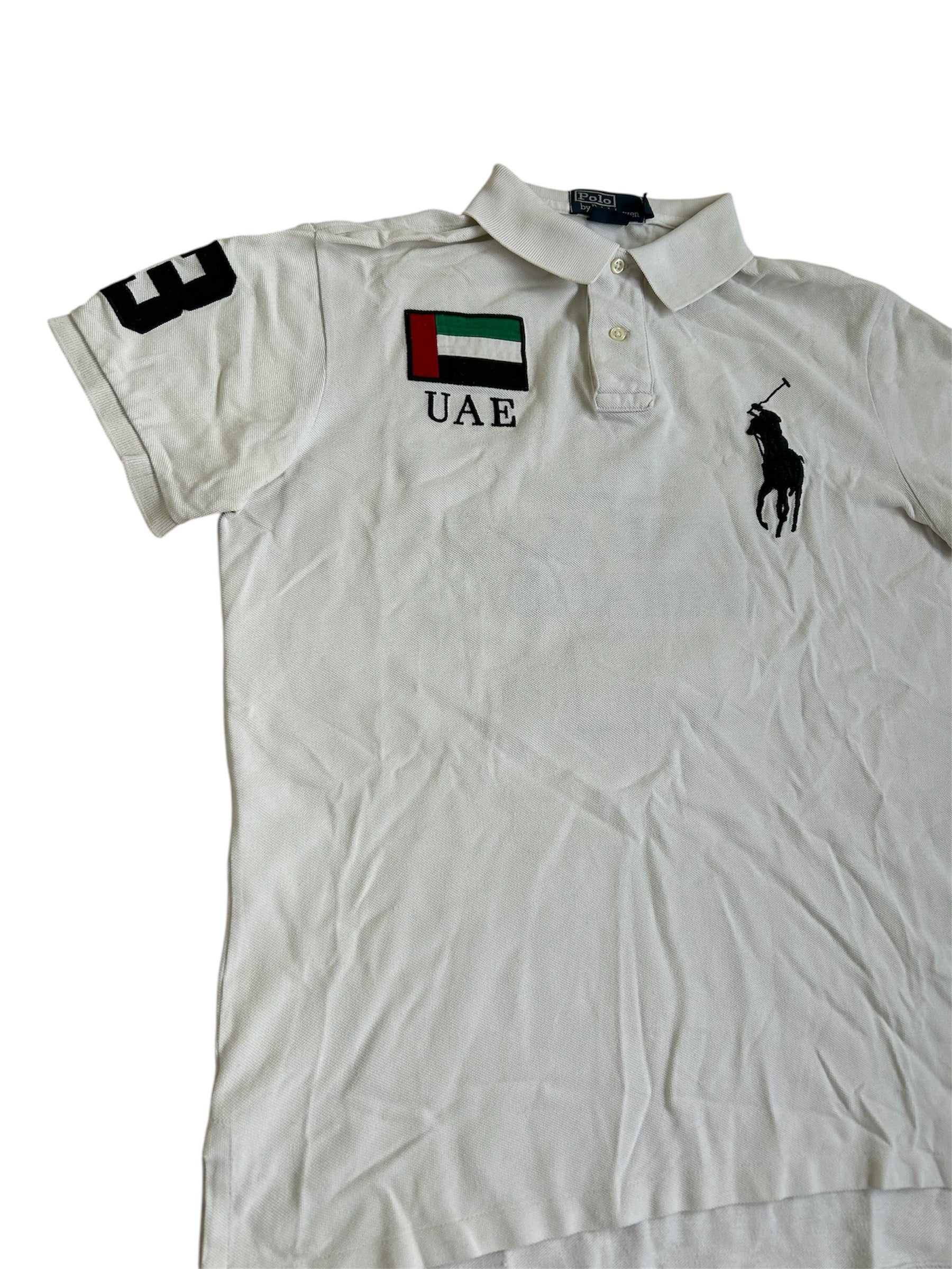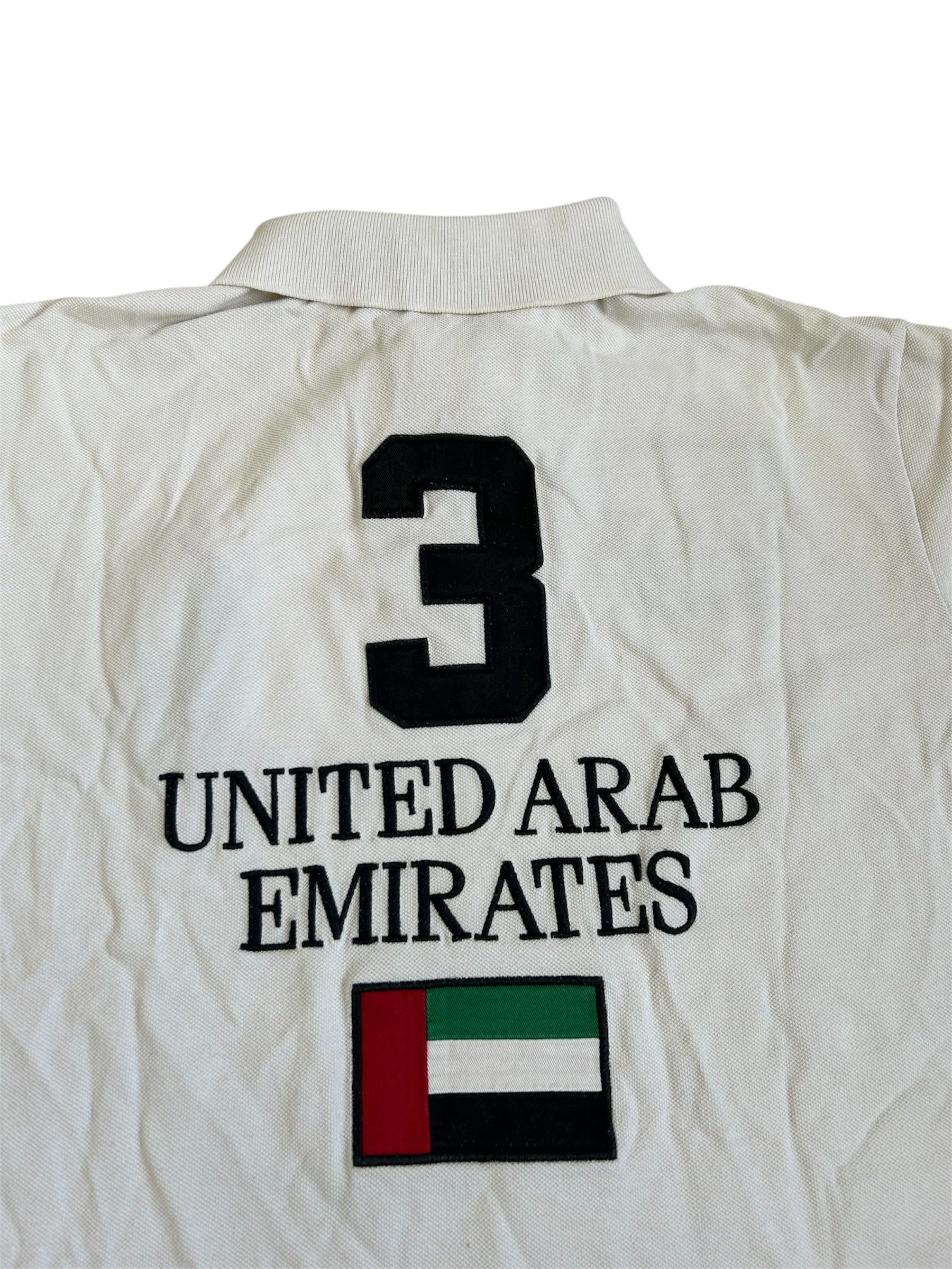 Made from 100% high-quality cotton, it features the Big Pony logo, bold "UAE" lettering, an embroidered UAE flag crest, and the number 3 on the sleeve—a signature detail in Ralph Lauren’s polo designs. No longer in production, making it a rare and collectible item for Ralph Lauren enthusiasts.