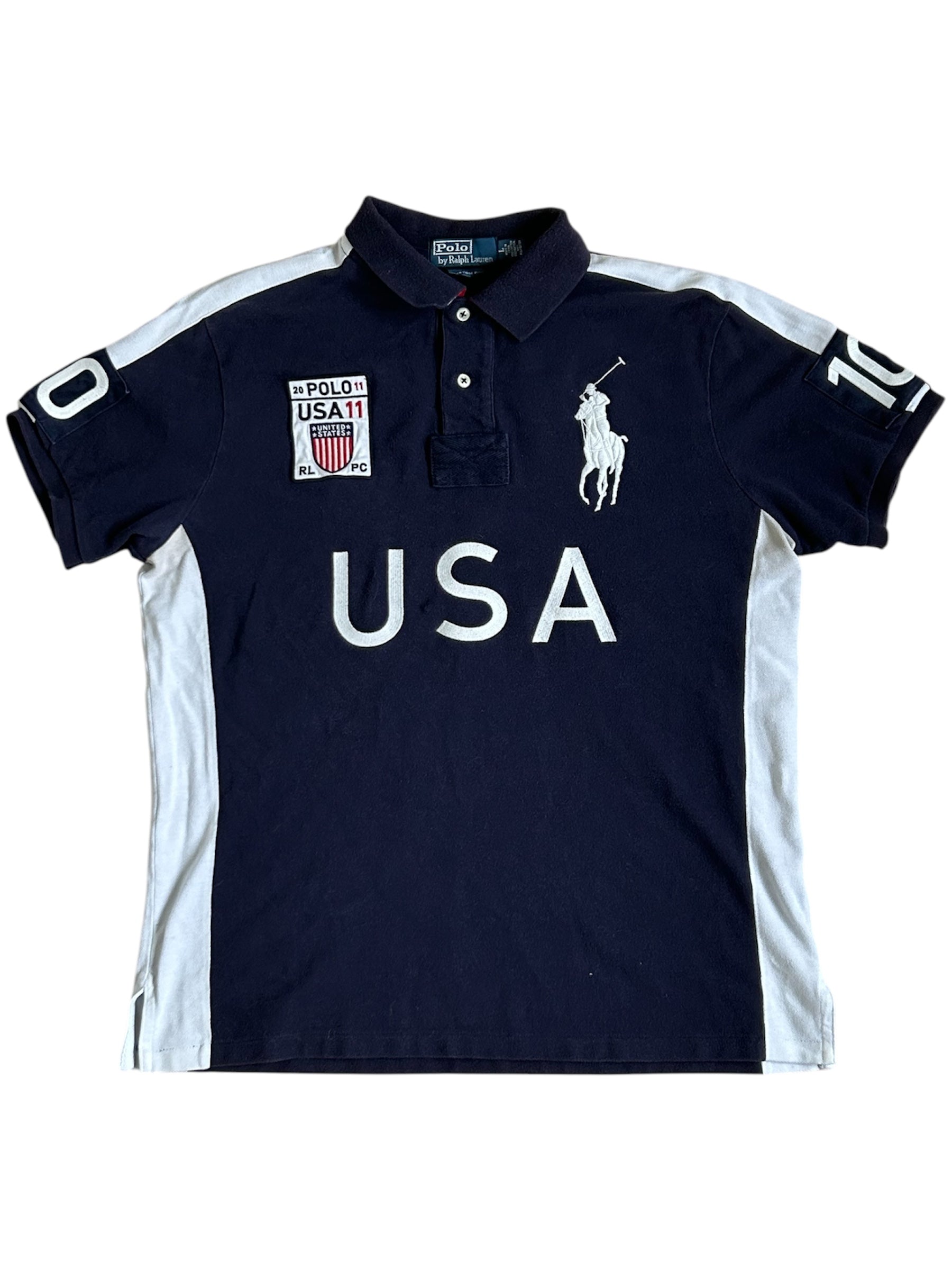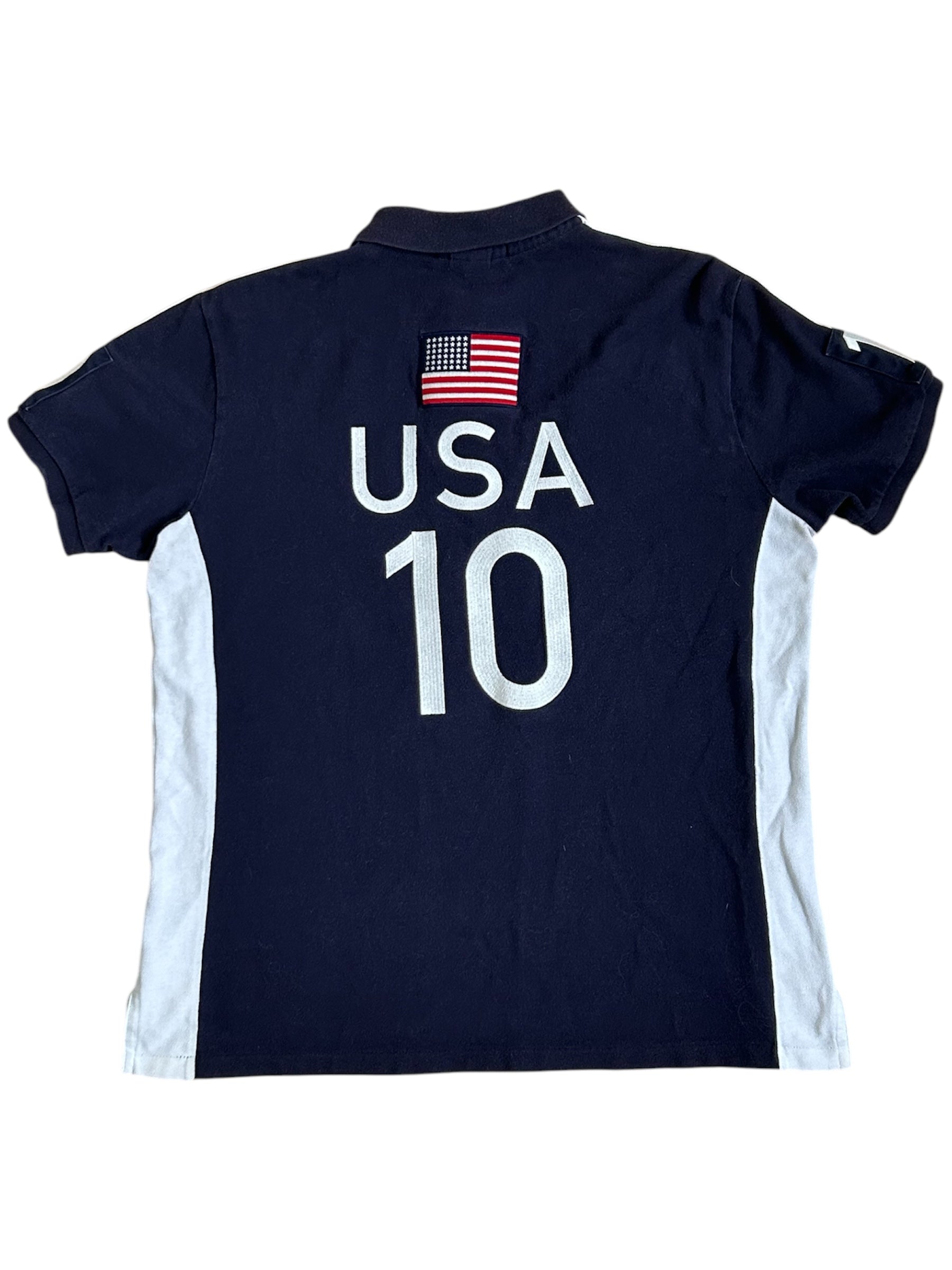 Made from 100% high-quality cotton, it features the Big Pony logo, bold "USA" lettering, an embroidered USA team crest, and the number 10 on both sleeves—a signature detail in Ralph Lauren’s polo designs. No longer in production, making it a rare and collectible item for Ralph Lauren enthusiasts.