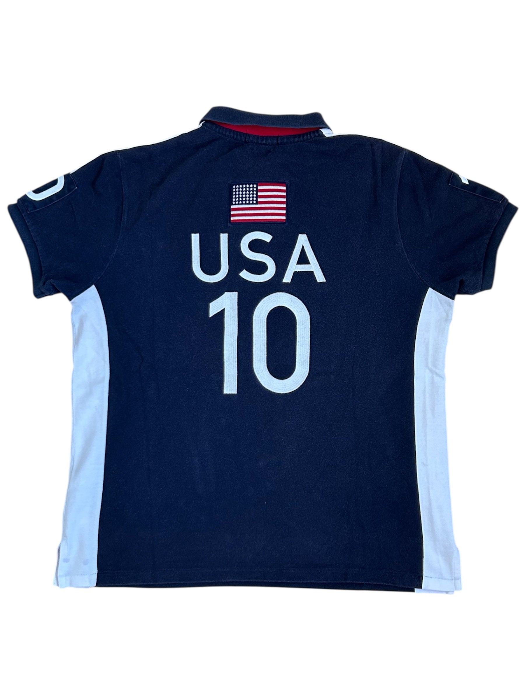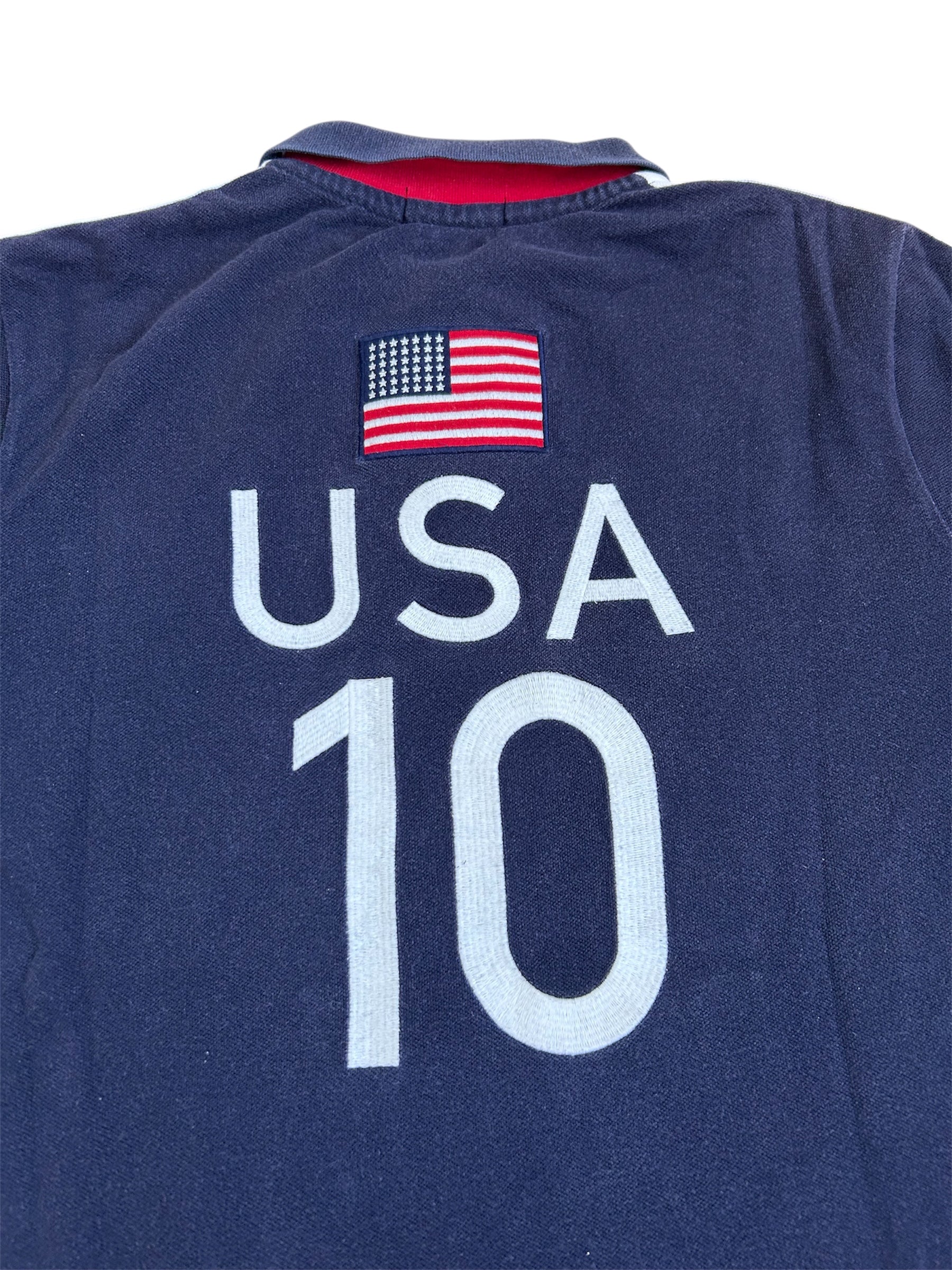 Made from 100% high-quality cotton, it features the Big Pony logo, bold "USA" lettering, an embroidered USA team crest, and the number 10 on both sleeves—a signature detail in Ralph Lauren’s polo designs. No longer in production, making it a rare and collectible item for Ralph Lauren enthusiasts.