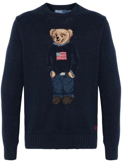 - Intarsia-knit bear featured prominently at the center front with intricate embroidered details.
