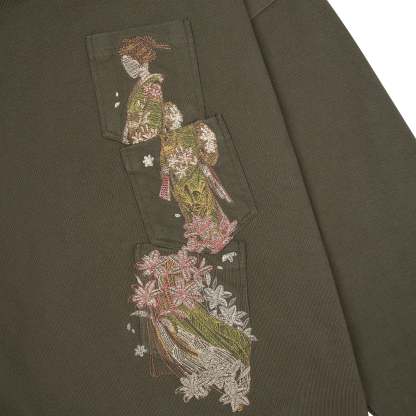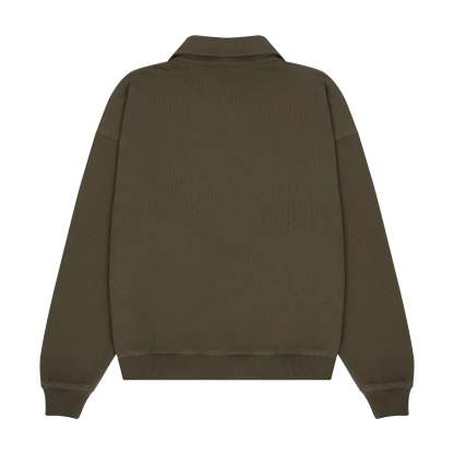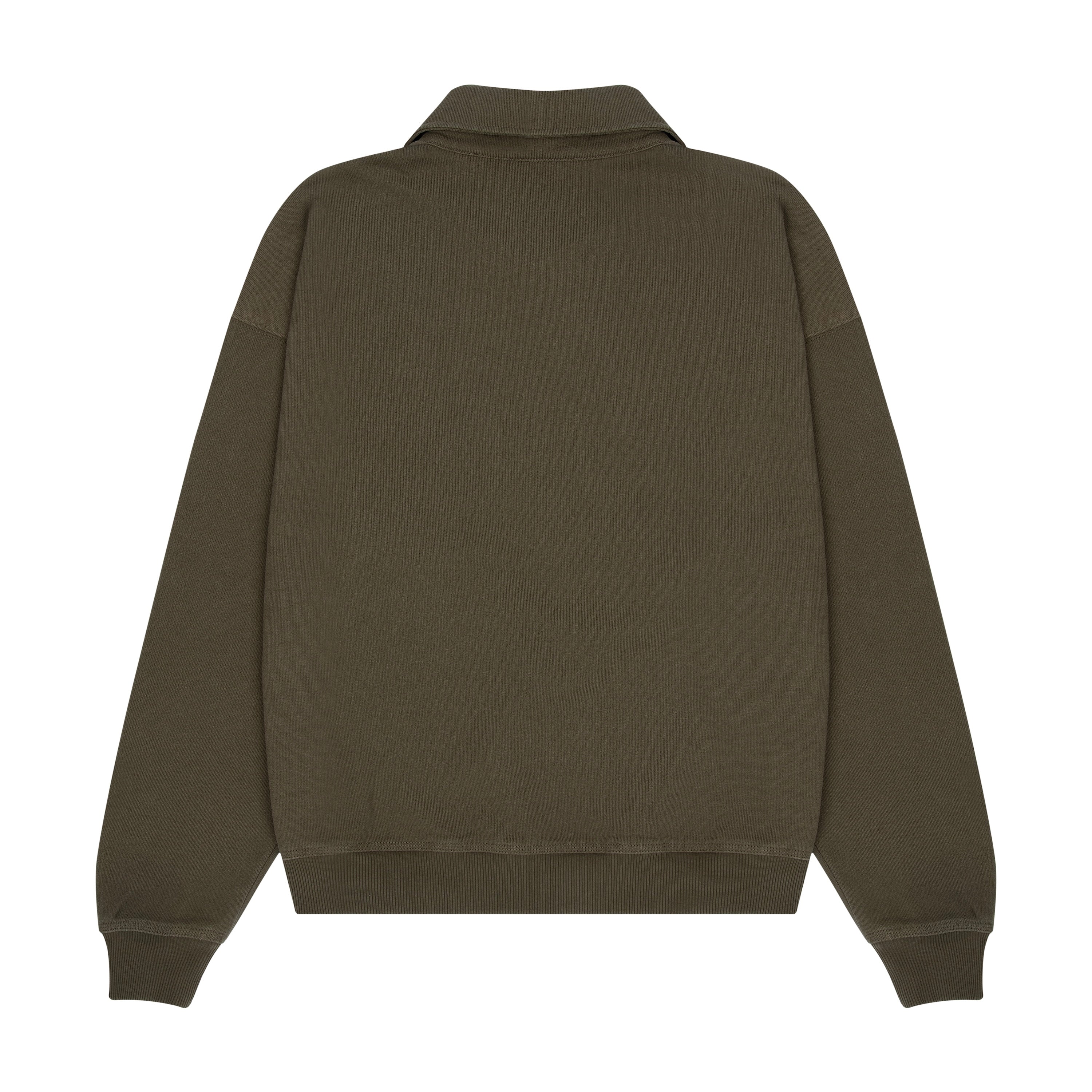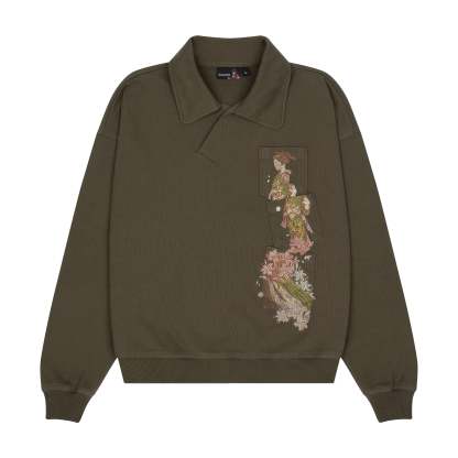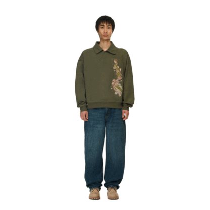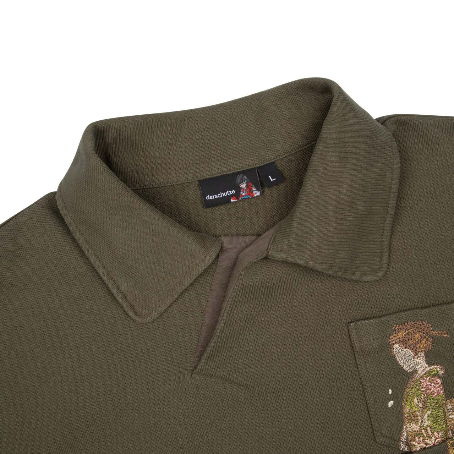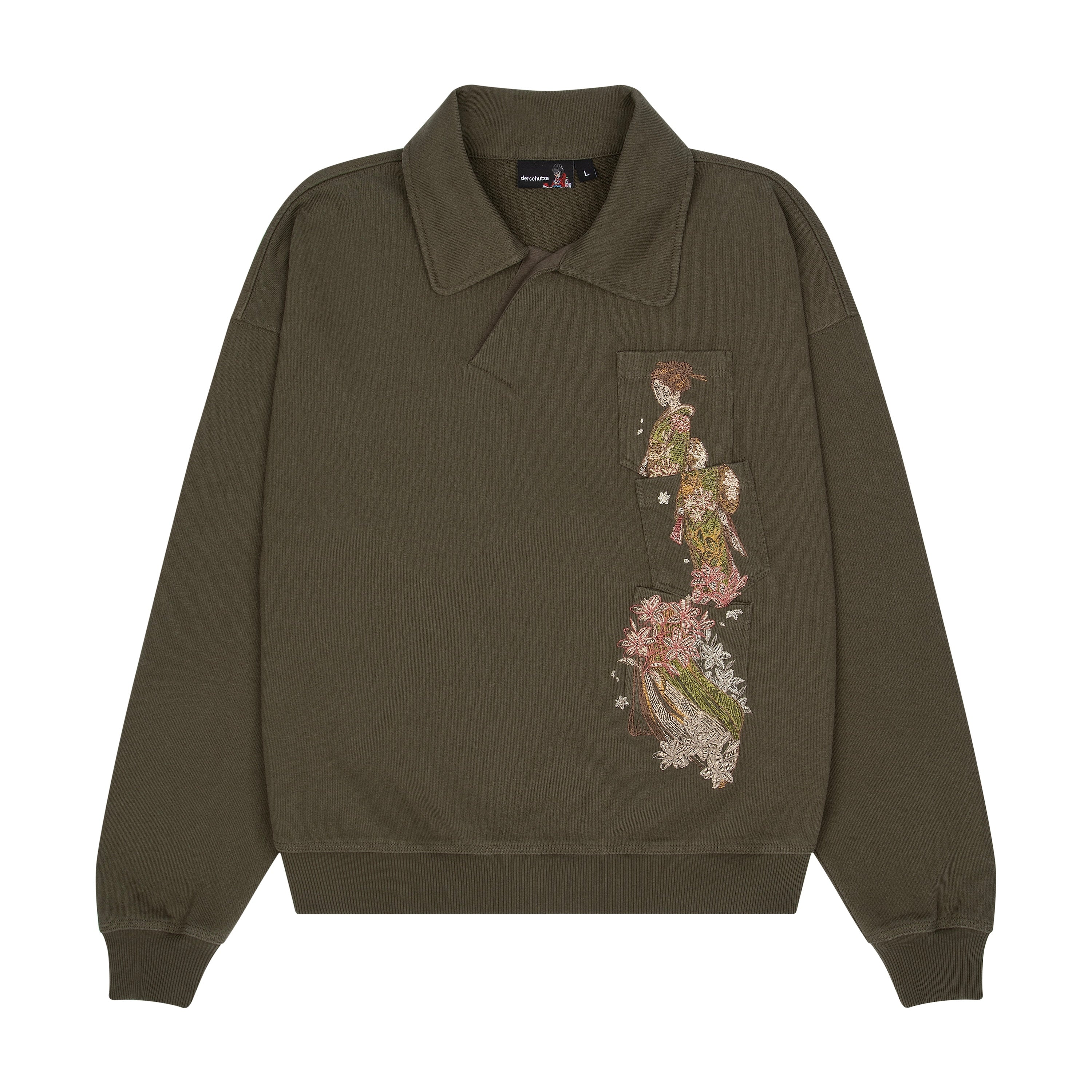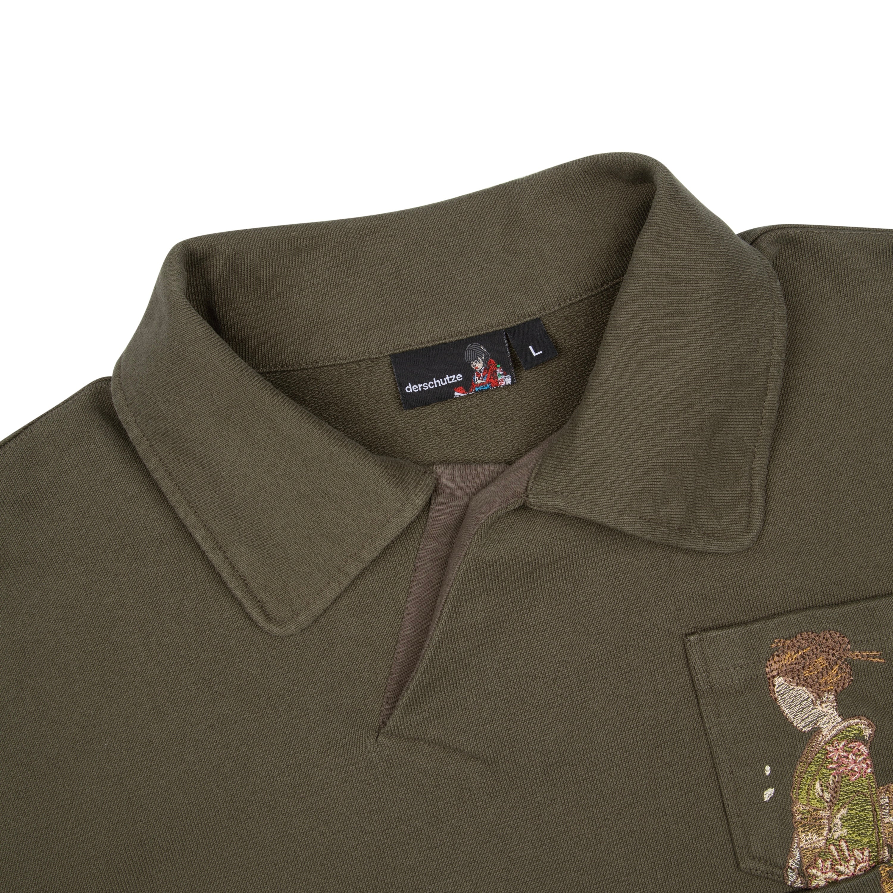 480gsm / 100% preshrunk cotton / embroidered pocket details on front / asymmetric collar with buttons inside / fits true to size